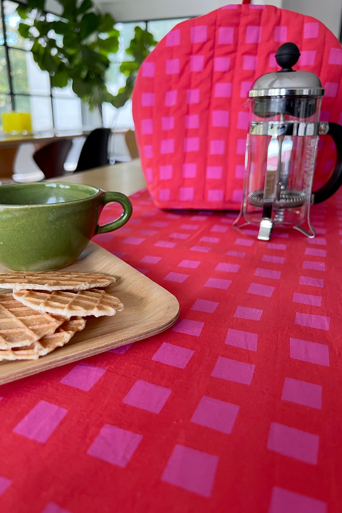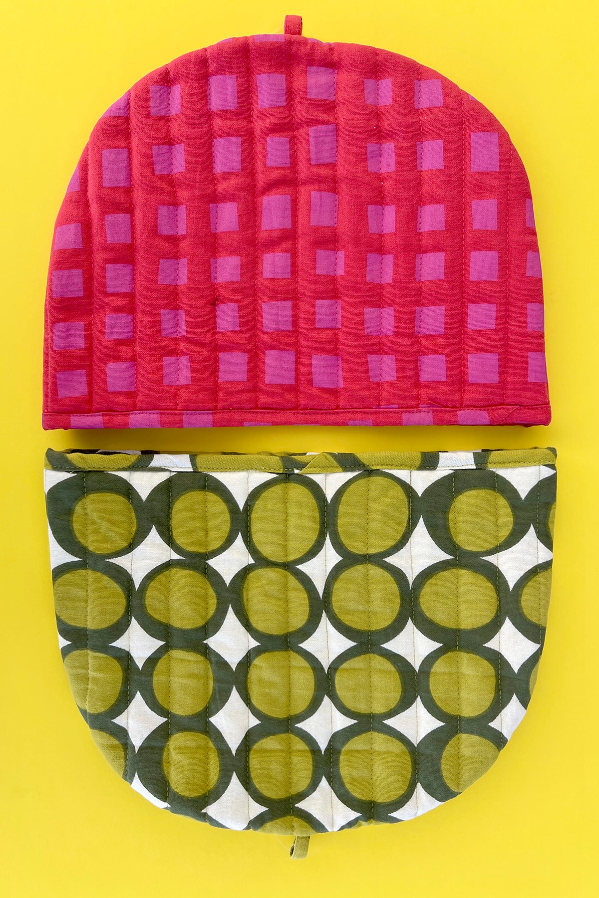Donna Gorman's vibrant, hand-painted designs combine bold colors and prints for an adorable tea cosy! Coordinates with the rest of the fall home collection: tea towels, aprons, oven mitts & potholders, napkins, placemats and runners.